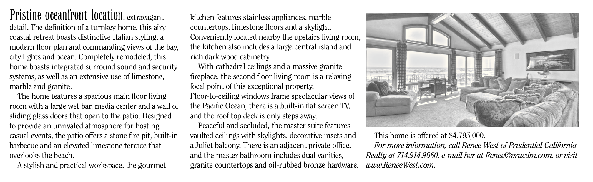 This home is offered at $4,795,000. For more information, call Renee West of Prudential California Realty at 714.914.9060, e-mail her at Renee@prucdm.com, or visit www.ReneeWest.com.