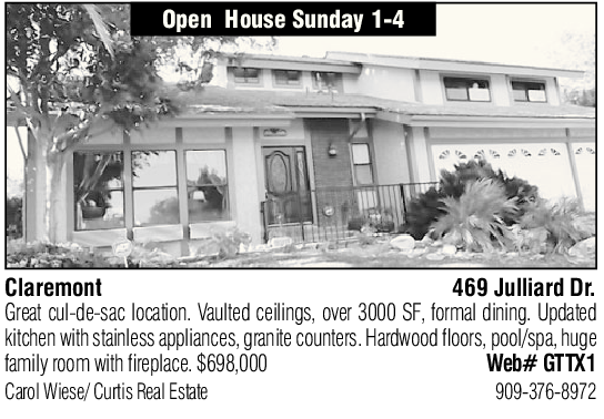 Open House Sunday 1-4 Claremont 469 Julliard Dr. Great cul-de-sac location. Vaulted ceilings, over 3000 SF, formal dining. Updated kitchen with stainless appliances, granite counters. Hardwood floors, pool/spa, huge family room with fireplace. $698,000 Web# GTTX1 Carol Wiese/ Curtis Real Estate 909-376-8972