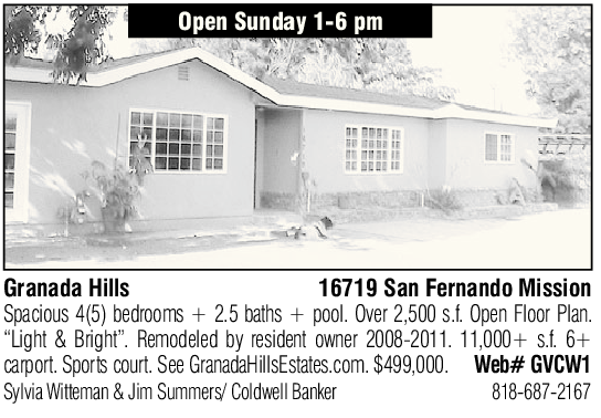 Open Sunday 1-6 pm Granada Hills 16719 San Fernando Mission Spacious 4(5) bedrooms + 2.5 baths + pool. Over 2,500 s.f. Open Floor Plan. “Light & Bright”. Remodeled by resident owner 2008-2011. 11,000+ s.f. 6+ carport. Sports court. See GranadaHillsEstates.com. $499,000. Web# GVCW1 Sylvia Witteman & Jim Summers/ Coldwell Banker 818-687-2167