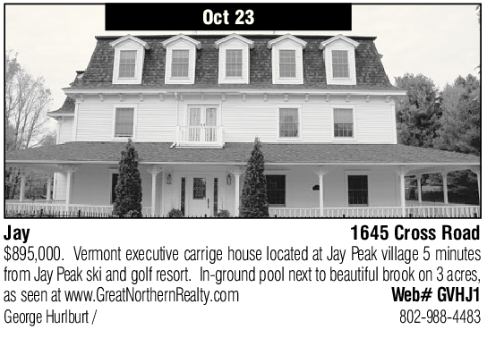 Jay 1645 Cross Road $895,000. Vermont executive carrige house located at Jay Peak village 5 minutes from Jay Peak ski and golf resort. In-ground pool next to beautiful brook on 3 acres, as seen at www.GreatNorthernRealty.com Web# GVHJ1 George Hurlburt / 802-988-4483
