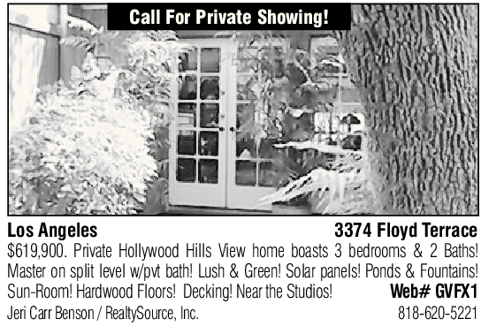 Call For Private Showing! Los Angeles 3374 Floyd Terrace $619,900. Private Hollywood Hills View home boasts 3 bedrooms & 2 Baths! Master on split level w/pvt bath! Lush & Green! Solar panels! Ponds & Fountains! Sun-Room! Hardwood Floors! Decking! Near the Studios! Web# GVFX1 Jeri Carr Benson / RealtySource, Inc. 818-620-5221