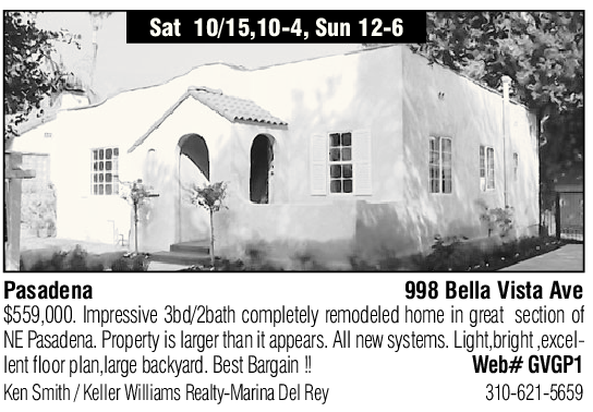 Pasadena 998 Bella Vista Ave $559,000. Impressive 3bd/2bath completely remodeled home in great section of NE Pasadena. Property is larger than it appears. All new systems. Light,bright ,excellent floor plan,large backyard. Best Bargain !! Web# GVGP1 Ken Smith / Keller Williams Realty-Marina Del Rey 310-621-5659