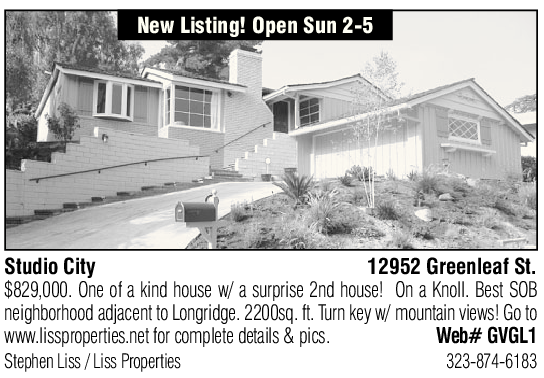 New Listing! Open Sun 2-5 Studio City 12952 Greenleaf St. $829,000. One of a kind house w/ a surprise 2nd house! On a Knoll. Best SOB neighborhood adjacent to Longridge. 2200sq. ft. Turn key w/ mountain views! Go to www.lissproperties.net for complete details & pics. Web# GVGL1 Stephen Liss / Liss Properties 323-874-6183