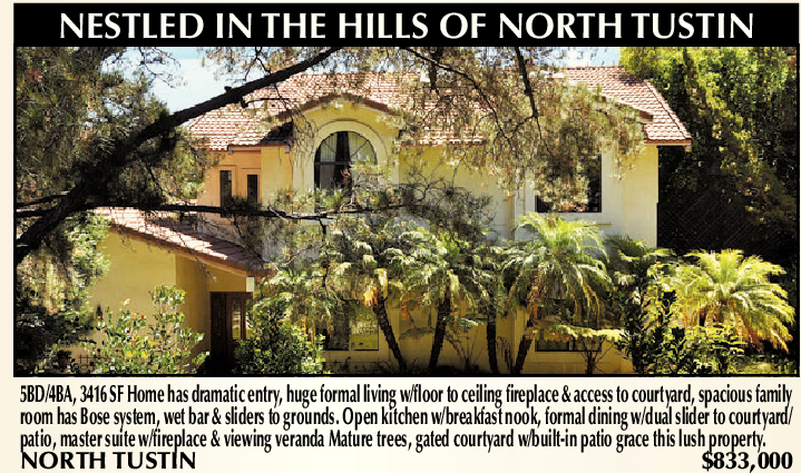 5BD/4BA, 3416 SF Home has dramatic entry, huge formal living w/floor to ceiling fireplace & access to courtyard, spacious family room has Bose system, wet bar & sliders to grounds. Open kitchen w/breakfast nook, formal dining w/dual slider to courtyard/ patio, master suite w/fireplace & viewing veranda Mature trees, gated courtyard w/built-in patio grace this lush property. NORTH TUSTIN $833,000