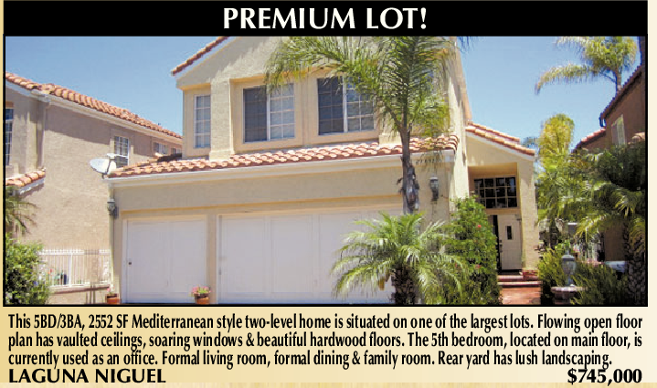 PREMIUM LOT! This 5BD/3BA, 2552 SF Mediterranean style two-level home is situated on one of the largest lots. Flowing open floor plan has vaulted ceilings, soaring windows & beautiful hardwood floors. The 5th bedroom, located on main floor, is currently used as an office. Formal living room, formal dining & family room. Rear yard has lush landscaping. LAGUNA NIGUEL $745,000
