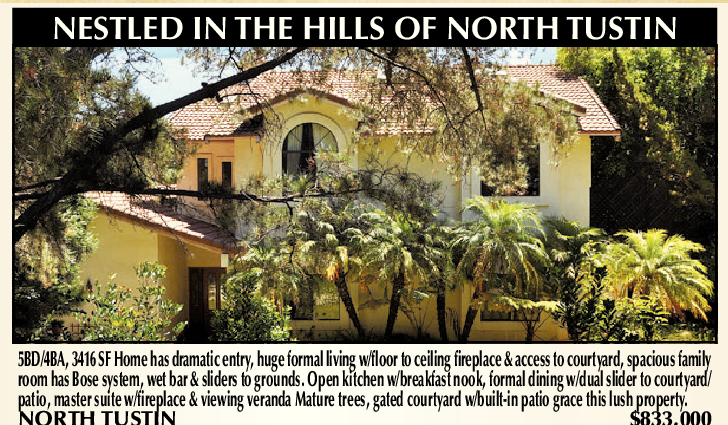 5BD/4BA, 3416 SF Home has dramatic entry, huge formal living w/floor to ceiling fireplace & access to courtyard, spacious family room has Bose system, wet bar & sliders to grounds. Open kitchen w/breakfast nook, formal dining w/dual slider to courtyard/ patio, master suite w/fireplace & viewing veranda Mature trees, gated courtyard w/built-in patio grace this lush property. NORTH TUSTIN $833,000