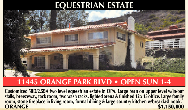 Customized 5BD/2.5BA two level equestrian estate in OPA. Large barn on upper level w/in/out stalls, breezeway, tack room, two wash racks, lighted arena & finished 12 x 15 office. Large family room, stone fireplace in living room, formal dining & large country kitchen w/breakfast nook. ORANGE $1,150,000
