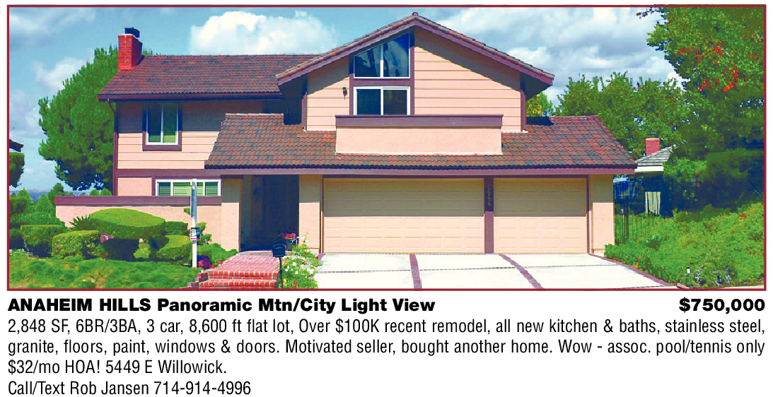 ANAHEIM HILLS Panoramic Mtn/City Light View $750,000 2,848 SF, 6BR/3BA, 3 car, 8,600 ft flat lot, Over $100K recent remodel, all new kitchen & baths, stainless steel, granite, floors, paint, windows & doors. Motivated seller, bought another home. Wow - assoc. pool/tennis only $32/mo HOA! 5449 E Willowick. Call/Text Rob Jansen 714-914-4996