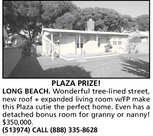 LONG BEACH. Wonderful tree-lined street, new roof + expanded living room w/FP make this Plaza cutie the perfect home. Even has a detached bonus room for granny or nanny! $350,000. (513974) CALL (888) 335-8628