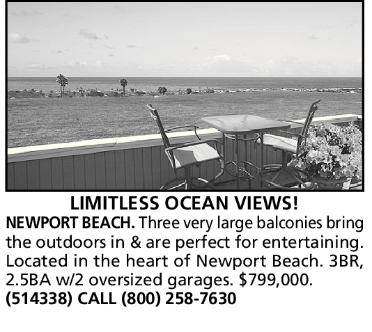 NEWPORT BEACH. Three very large balconies bring the outdoors in & are perfect for entertaining. Located in the heart of Newport Beach. 3BR, 2.5BA w/2 oversized garages. $799,000. (514338) CALL (800) 258-7630