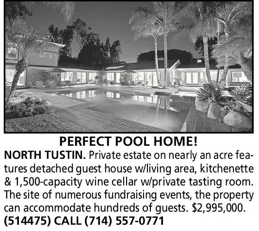 PERFECT POOL HOME! NORTH TUSTIN. Private estate on nearly an acre features detached guest house w/living area, kitchenette & 1,500-capacity wine cellar w/private tasting room. The site of numerous fundraising events, the property can accommodate hundreds of guests. $2,995,000. (514475) CALL (714) 557-0771