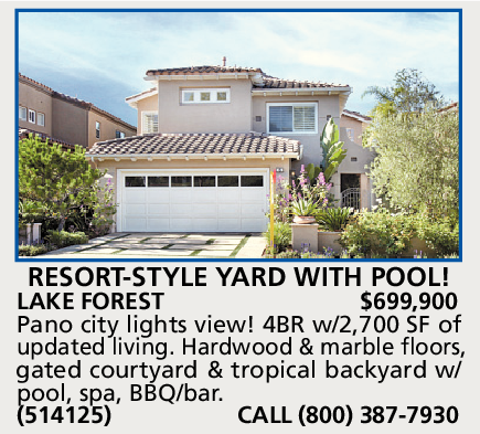 LAKE FOREST $699,900 Pano city lights view! 4BR w/2,700 SF of updated living. Hardwood & marble floors, gated courtyard & tropical backyard w/ pool, spa, BBQ/bar. (514125) CALL (800) 387-7930