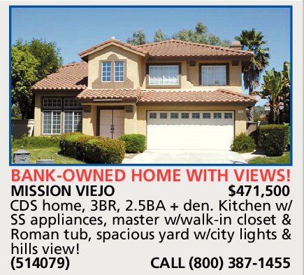BANK-OWNED HOME WITH VIEWS! MISSION VIEJO $471,500 CDS home, 3BR, 2.5BA + den. Kitchen w/ SS appliances, master w/walk-in closet & Roman tub, spacious yard w/city lights & hills view! (514079) CALL (800) 387-1455