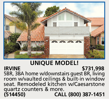 IRVINE $731,998 5BR, 3BA home w/downstairs guest BR, living room w/vaulted ceilings & built-in window seat. Remodeled kitchen w/Caesarstone quartz counters & more. (514450) CALL (800) 387-1451
