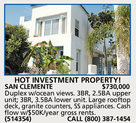 SAN CLEMENTE $730,000 Duplex w/ocean views. 3BR, 2.5BA upper unit; 3BR, 3.5BA lower unit. Large rooftop deck, granite counters, SS appliances. Cash flow w/$50K/year gross rents. (514354) CALL (800) 387-1454