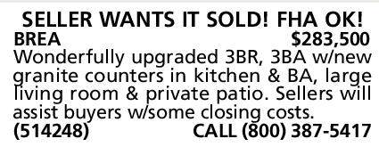 BREA $283,500 Wonderfully upgraded 3BR, 3BA w/new granite counters in kitchen & BA, large living room & private patio. Sellers will assist buyers w/some closing costs. (514248) CALL (800) 387-5417