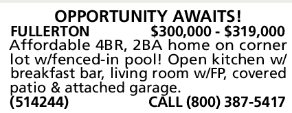 FULLERTON $300,000 - $319,000 Affordable 4BR, 2BA home on corner lot w/fenced-in pool! Open kitchen w/ breakfast bar, living room w/FP, covered patio & attached garage. (514244) CALL (800) 387-5417