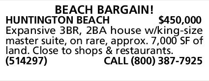 HUNTINGTON BEACH $450,000 Expansive 3BR, 2BA house w/king-size master suite, on rare, approx. 7,000 SF of land. Close to shops & restaurants. (514297) CALL (800) 387-7925