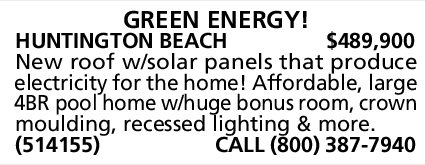 HUNTINGTON BEACH $489,900 New roof w/solar panels that produce electricity for the home! Affordable, large 4BR pool home w/huge bonus room, crown moulding, recessed lighting & more. (514155) CALL (800) 387-7940