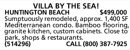 HUNTINGTON BEACH $499,000 Sumptuously remodeled, approx. 1,400 SF Mediterranean condo. Bamboo flooring, granite kitchen, custom cabinets. Close to park, shops & restaurants. (514296) CALL (800) 387-7925