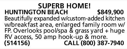 HUNTINGTON BEACH $849,900 Beautifully expanded w/custom-added kitchen w/breakfast area, enlarged family room w/ FP. Overlooks pool/spa & grass yard + huge RV access, 50 amp hook-up & more.