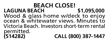 LAGUNA BEACH $1,095,000 Wood & glass home w/deck to enjoy ocean & whitewater views. Minutes to Victoria Beach. Investors short-term rental permitted. (514282) CALL (800) 387-1447