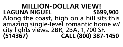 LAGUNA NIGUEL $699,900 Along the coast, high on a hill sits this amazing single-level romantic home w/ city lights views. 2BR, 2BA, 1,700 SF. (514367) CALL (800) 387-1450