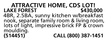 LAKE FOREST $430,000 4BR, 2.5BA, sunny kitchen w/breakfast nook, separate family room & living room, lots of light, impressive brick FP & crown moulding. (514451) CALL (800) 387-1451