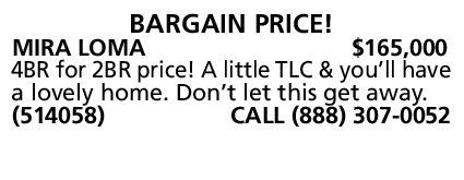 MIRA LOMA $165,000 4BR for 2BR price! A little TLC & you’ll have a lovely home. Don’t let this get away. (514058) CALL (888) 307-0052