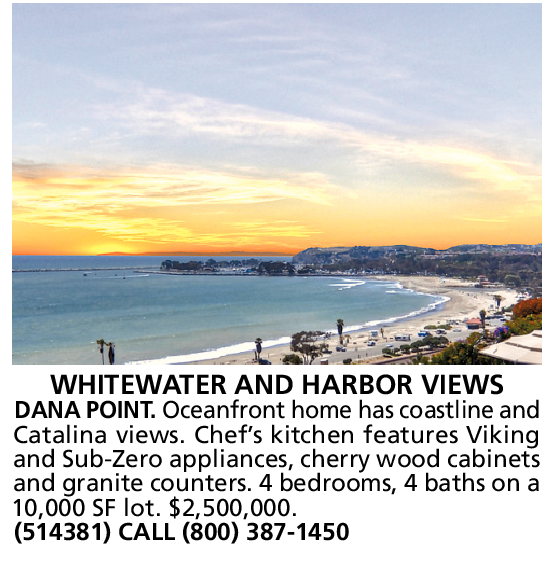 pool, room, WHITEWATER AND HARBOR VIEWS DANA POINT. Oceanfront home has coastline and Catalina views. Chef’s kitchen features Viking and Sub-Zero appliances, cherry wood cabinets and granite counters. 4 bedrooms, 4 baths on a 10,000 SF lot. $2,500,000. (514381) CALL (800) 387-1450