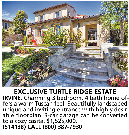 EXCLUSIVE TURTLE RIDGE ESTATE IRVINE. Charming 3 bedroom, 4 bath home offers a warm Tuscan feel. Beautifully landscaped, unique and inviting entrance with highly desirable floorplan. 3-car garage can be converted to a cozy casita. $1,525,000. (514138) CALL (800) 387-7930