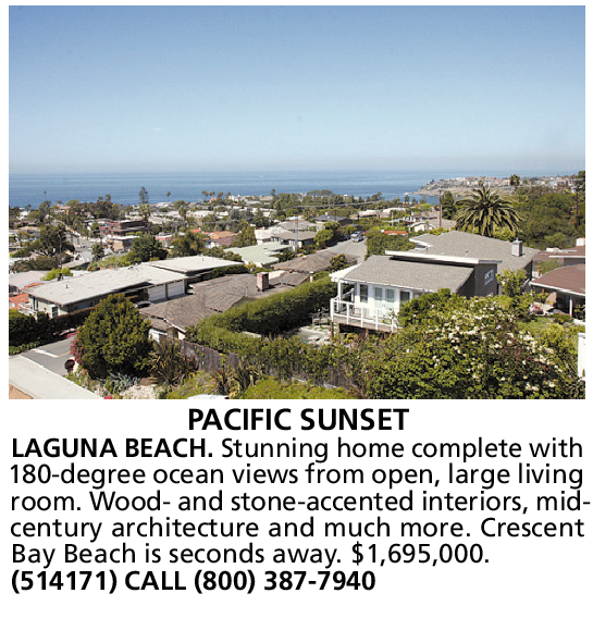 PACIFIC SUNSET LAGUNA BEACH. Stunning home complete with 180-degree ocean views from open, large living room. Wood- and stone-accented interiors, midcentury architecture and much more. Crescent Bay Beach is seconds away. $1,695,000. (514171) CALL (800) 387-7940