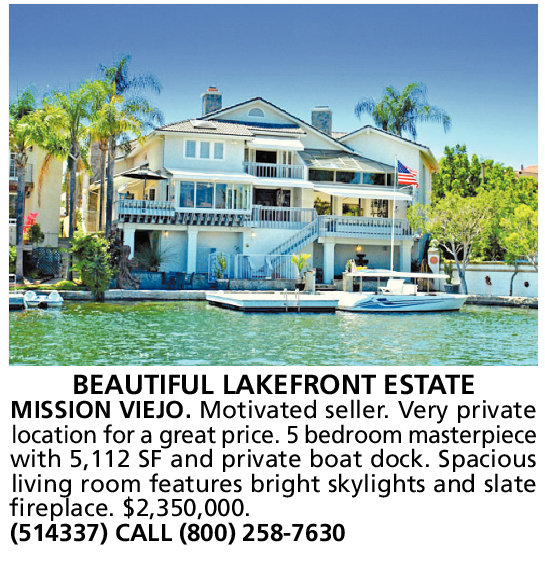 BEAUTIFUL LAKEFRONT ESTATE MISSION VIEJO. Motivated seller. Very private location for a great price. 5 bedroom masterpiece with 5,112 SF and private boat dock. Spacious living room features bright skylights and slate fireplace. $2,350,000. (514337) CALL (800) 258-7630
