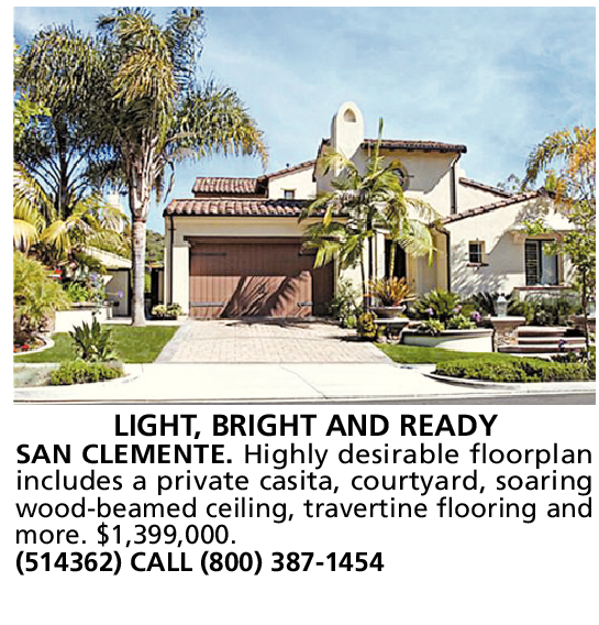 LIGHT, BRIGHT AND READY SAN CLEMENTE. Highly desirable floorplan includes a private casita, courtyard, soaring wood-beamed ceiling, travertine flooring and more. $1,399,000.