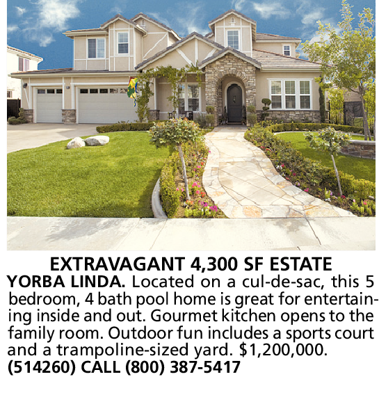 EXTRAVAGANT 4,300 SF ESTATE YORBA LINDA. Located on a cul-de-sac, this 5 bedroom, 4 bath pool home is great for entertaining inside and out. Gourmet kitchen opens to the family room. Outdoor fun includes a sports court and a trampoline-sized yard. $1,200,000. (514260) CALL (800) 387-5417