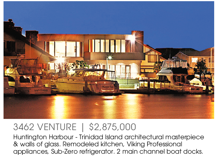 3462 VENTURE | $2,875,000 Huntington Harbour - Trinidad Island architectural masterpiece & walls of glass. Remodeled kitchen, Viking Professional appliances, Sub-Zero refrigerator. 2 main channel boat docks.