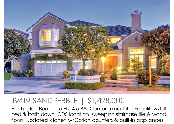 19419 SANDPEBBLE | $1,428,000 Huntington Beach - 5 BR, 4.5 BA. Cambria model in Seacliff w/full bed & bath down. CDS location, sweeping staircase tile & wood floors, updated kitchen w/Corian counters & built-in appliances.