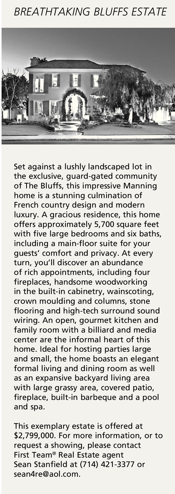 BREATHTAKING BLUFFS ESTATE Set against a lushly landscaped lot in the exclusive, guard-gated community of The Bluffs, this impressive Manning home is a stunning culmination of French country design and modern luxury. A gracious residence, this home offers approximately 5,700 square feet with five large bedrooms and six baths, including a main-floor suite for your guests’ comfort and privacy. At every turn, you’ll discover an abundance of rich appointments, including four fireplaces, handsome woodworking in the built-in cabinetry, wainscoting, crown moulding and columns, stone flooring and high-tech surround sound wiring. An open, gourmet kitchen and family room with a billiard and media center are the informal heart of this home. Ideal for hosting parties large and small, the home boasts an elegant formal living and dining room as well as an expansive backyard living area with large grassy area, covered patio, fireplace, built-in barbeque and a pool and spa. This exemplary estate is offered at $2,799,000. For more information, or to request a showing, please contact First Team ® Real Estate agent Sean Stanfield at (714) 421-3377 or sean4re@aol.com.