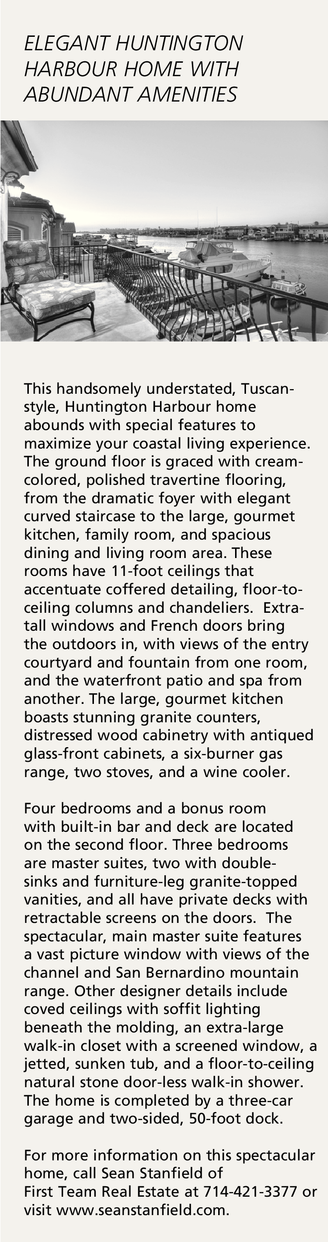 ELEGANT HUNTINGTON HARBOUR HOME WITH ABUNDANT AMENITIES This handsomely understated, Tuscanstyle, Huntington Harbour home abounds with special features to maximize your coastal living experience. The ground floor is graced with creamcolored, polished travertine flooring, from the dramatic foyer with elegant curved staircase to the large, gourmet kitchen, family room, and spacious dining and living room area. These rooms have 11-foot ceilings that accentuate coffered detailing, floor-toceiling columns and chandeliers. Extratall windows and French doors bring the outdoors in, with views of the entry courtyard and fountain from one room, and the waterfront patio and spa from another. The large, gourmet kitchen boasts stunning granite counters, distressed wood cabinetry with antiqued glass-front cabinets, a six-burner gas range, two stoves, and a wine cooler. Four bedrooms and a bonus room with built-in bar and deck are located on the second floor. Three bedrooms are master suites, two with doublesinks and furniture-leg granite-topped vanities, and all have private decks with retractable screens on the doors. The spectacular, main master suite features a vast picture window with views of the channel and San Bernardino mountain range. Other designer details include coved ceilings with soffit lighting beneath the molding, an extra-large walk-in closet with a screened window, a jetted, sunken tub, and a floor-to-ceiling natural stone door-less walk-in shower. The home is completed by a three-car garage and two-sided, 50-foot dock. For more information on this spectacular home, call Sean Stanfield of First Team Real Estate at 714-421-3377 or visit www.seanstanfield.com.
