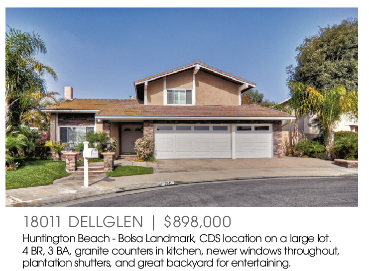 18011 DELLGLEN | $898,000 Huntington Beach - Bolsa Landmark, CDS location on a large lot. 4 BR, 3 BA, granite counters in kitchen, newer windows throughout, plantation shutters, and great backyard for entertaining.