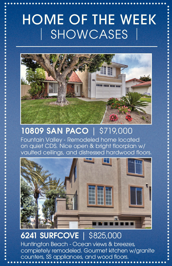 HOME OF THE WEEK | SHOWCASES | 10809 SAN PACO | $719,000 Fountain Valley - Remodeled home located on quiet CDS. Nice open & bright floorplan w/ vaulted ceilings, and distressed hardwood floors. 6241 SURFCOVE | $825,000 Huntington Beach - Ocean views & breezes, completely remodeled. Gourmet kitchen w/granite counters, SS appliances, and wood floors.