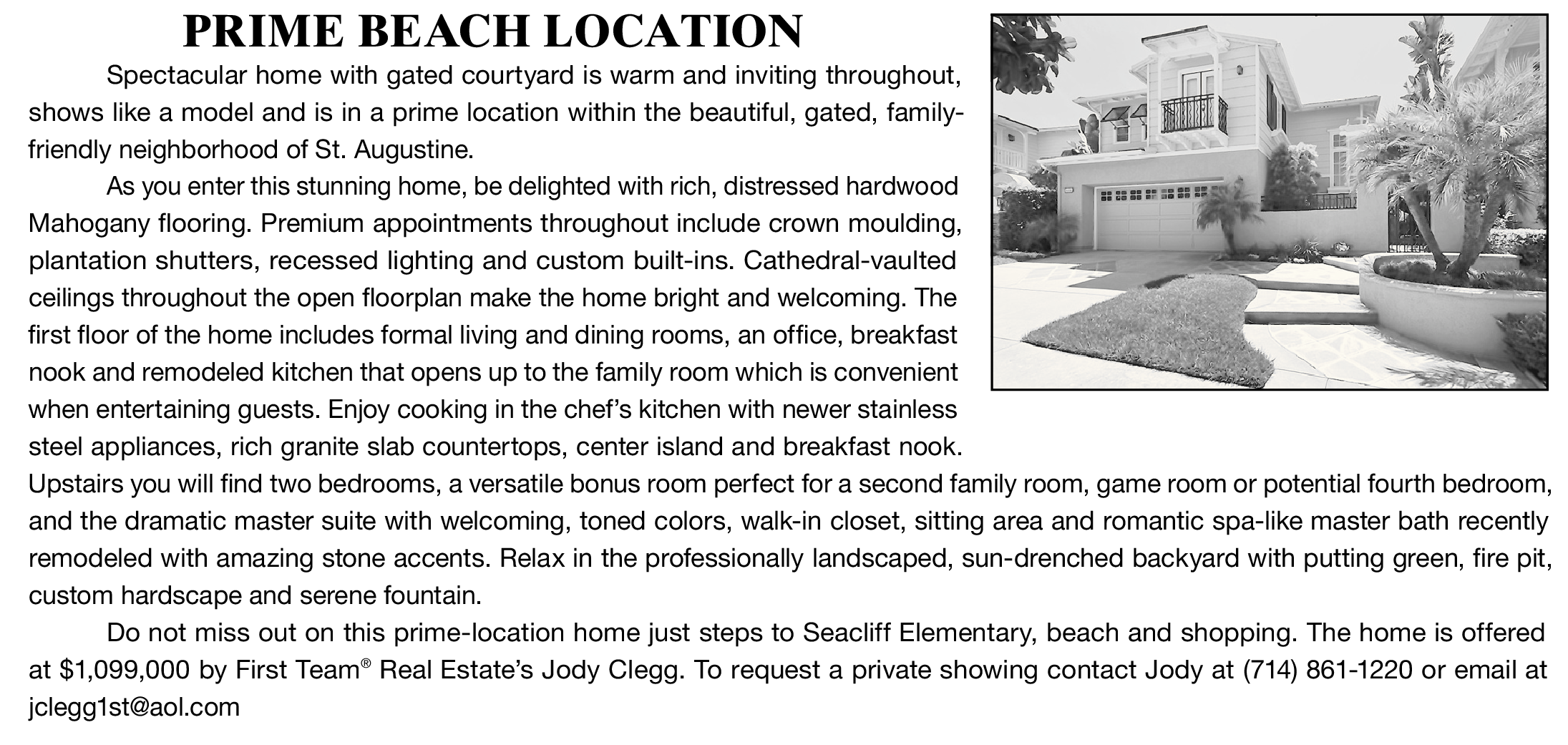 PRIME BEACH LOCATION Spectacular home with gated courtyard is warm and inviting throughout, shows like a model and is in a prime location within the beautiful, gated, familyfriendly neighborhood of St. Augustine. As you enter this stunning home, be delighted with rich, distressed hardwood Mahogany flooring. Premium appointments throughout include crown moulding, plantation shutters, recessed lighting and custom built-ins. Cathedral-vaulted ceilings throughout the open floorplan make the home bright and welcoming. The first floor of the home includes formal living and dining rooms, an offi ce, breakfast nook and remodeled kitchen that opens up to the family room which is convenient when entertaining guests. Enjoy cooking in the chef’s kitchen with newer stainless steel appliances, rich granite slab countertops, center island and breakfast nook. Upstairs you will find two bedrooms, a versatile bonus room perfect for a second family room, game room or potential fourth bedroom, and the dramatic master suite with welcoming, toned colors, walk-in closet, sitting area and romantic spa-like master bath recently remodeled with amazing stone accents. Relax in the professionally landscaped, sun-drenched backyard with putting green, fire pit, custom hardscape and serene fountain. Do not miss out on this prime-location home just steps to Seacliff Elementary, beach and shopping. The home is offered at $1,099,000 by First Team ® Real Estate’s Jody Clegg. To request a private showing contact Jody at (714) 861-1220 or email at jclegg1st@aol.com