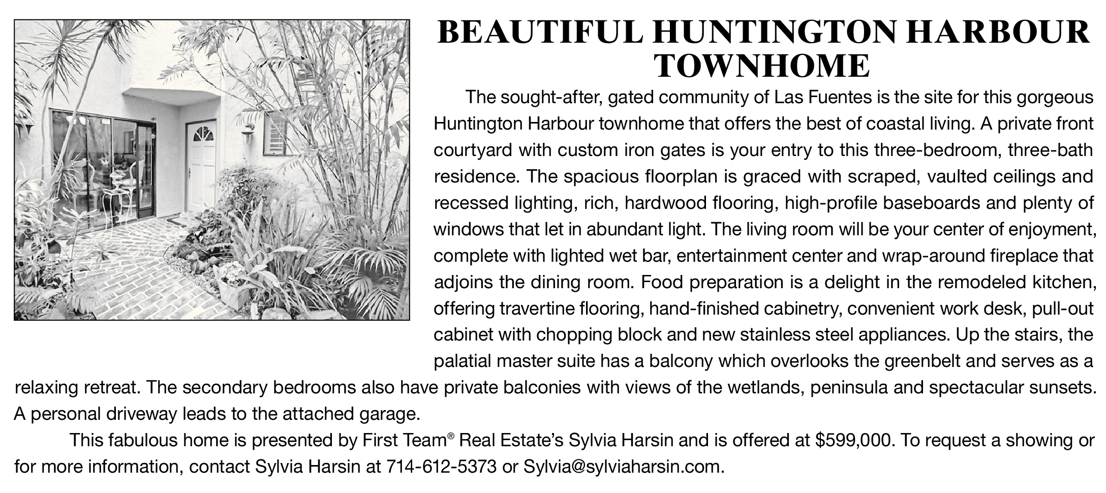 BEAUTIFUL HUNTINGTON HARBOUR TOWNHOME The sought-after, gated community of Las Fuentes is the site for this gorgeous Huntington Harbour townhome that offers the best of coastal living. A private front courtyard with custom iron gates is your entry to this three-bedroom, three-bath residence. The spacious floorplan is graced with scraped, vaulted ceilings and recessed lighting, rich, hardwood flooring, high-profile baseboards and plenty of windows that let in abundant light. The living room will be your center of enjoyment, complete with lighted wet bar, entertainment center and wrap-around fireplace that adjoins the dining room. Food preparation is a delight in the remodeled kitchen, offering travertine flooring, hand-finished cabinetry, convenient work desk, pull-out cabinet with chopping block and new stainless steel appliances. Up the stairs, the palatial master suite has a balcony which overlooks the greenbelt and serves as a relaxing retreat. The secondary bedrooms also have private balconies with views of the wetlands, peninsula and spectacular sunsets. A personal driveway leads to the attached garage. This fabulous home is presented by First Team ® Real Estate’s Sylvia Harsin and is offered at $599,000. To request a showing or for more information, contact Sylvia Harsin at 714-612-5373 or Sylvia@sylviaharsin.com.