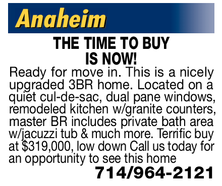 Ready for move in. This is a nicely upgraded 3BR home. Located on a quiet cul-de-sac, dual pane windows, remodeled kitchen w/granite counters, master BR includes private bath area w/jacuzzi tub & much more. Terrific buy at $319,000, low down Call us today for an opportunity to see this home 714/964-2121