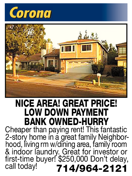 Corona NICE AREA! GREAT PRICE! LOW DOWN PAYMENT BANK OWNED-HURRY Cheaper than paying rent! This fantastic 2-story home in a great family Neighborhood, living rm w/dining area, family room & indoor laundry. Great for investor or first-time buyer! $250,000 Don’t delay, call today! 714/964-2121