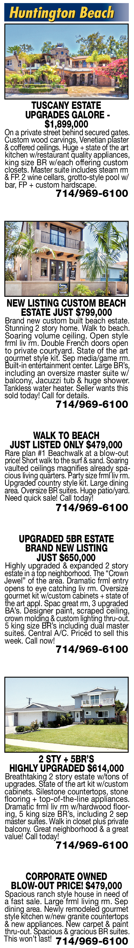 NEW LISTING CUSTOM BEACH ESTATE JUST $799,000 Brand new custom built beach estate. Stunning 2 story home. Walk to beach. Soaring volume ceiling. Open style frml liv rm. Double French doors open to private courtyard. State of the art gourmet style kit. Sep media/game rm. Built-in entertainment center. Large BR’s, including an oversize master suite w/ balcony, Jacuzzi tub & huge shower.