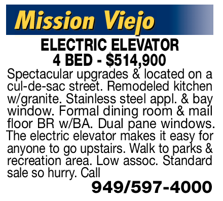 Mission Viejo ELECTRIC ELEVATOR 4 BED - $514,900 Spectacular upgrades & located on a cul-de-sac street. Remodeled kitchen w/granite. Stainless steel appl. & bay window. Formal dining room & mail floor BR w/BA. Dual pane windows. The electric elevator makes it easy for anyone to go upstairs. Walk to parks & recreation area. Low assoc. Standard sale so hurry. Call 949/597-4000 See also