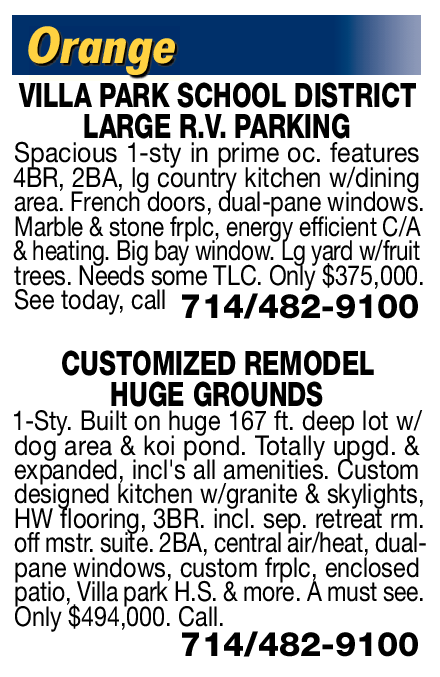 Orange VILLA PARK SCHOOL DISTRICT LARGE R.V. PARKING Spacious 1-sty in prime oc. features 4BR, 2BA, lg country kitchen w/dining area. French doors, dual-pane windows. Marble & stone frplc, energy efficient C/A & heating. Big bay window. Lg yard w/fruit trees. Needs some TLC. Only $375,000. See today, call 714/482-9100 CUSTOMIZED REMODEL HUGE GROUNDS 1-Sty. Built on huge 167 ft. deep lot w/ dog area & koi pond. Totally upgd. & expanded, incl's all amenities. Custom designed kitchen w/granite & skylights, HW flooring, 3BR. incl. sep. retreat rm. off mstr. suite. 2BA, central air/heat, dualpane windows, custom frplc, enclosed patio, Villa park H.S. & more. A must see. Only $494,000. Call. 714/482-9100