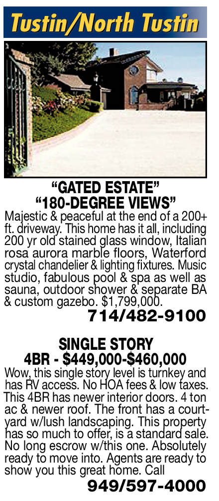 Tustin/North Tustin “GATED ESTATE” “180-DEGREE VIEWS” Majestic & peaceful at the end of a 200+ ft. driveway. This home has it all, including 200 yr old stained glass window, Italian rosa aurora marble floors, Waterford crystal chandelier & lighting fixtures. Music studio, fabulous pool & spa as well as sauna, outdoor shower & separate BA & custom gazebo. $1,799,000. 714/482-9100 SINGLE STORY 4BR - $449,000-$460,000 Wow, this single story level is turnkey and has RV access. No HOA fees & low taxes. This 4BR has newer interior doors. 4 ton ac & newer roof. The front has a courtyard w/lush landscaping. This property has so much to offer, is a standard sale. No long escrow w/this one. Absolutely ready to move into. Agents are ready to show you this great home. Call 949/597-4000
