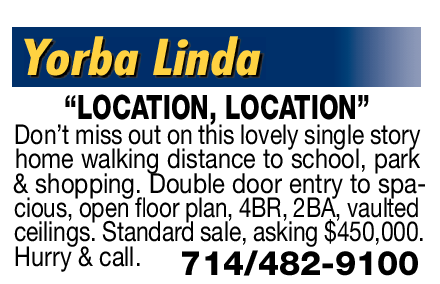 Yorba Linda “LOCATION, LOCATION” Don’t miss out on this lovely single story home walking distance to school, park & shopping. Double door entry to spacious, open floor plan, 4BR, 2BA, vaulted ceilings. Standard sale, asking $450,000. Hurry & call. 714/482-9100